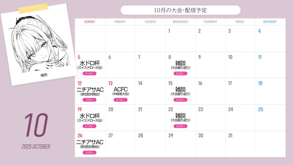 10月からは自大会(水ドロ杯・中級者大会ACFC)を再開する予定ですがAC絡み以外のことで色々とやらなければならないことを抱えているので配信の頻度は少なめといった具合です。大会の周期については配信でお伝えしていたよう、日曜に全てを集約し開催週についても固定化する方向で今後運営してまいります。※10月度の中級者大会は諸事情により翌日の13日となります。